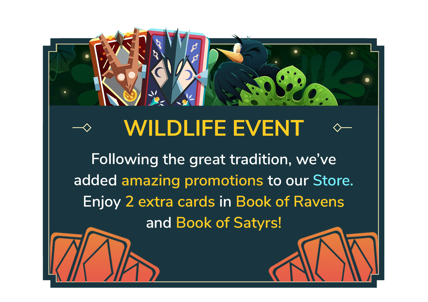 Book of Ravens and Book of Satyrs will yield 2 extra cards for the duration of the whole event in store, starting from March 4th until March 10th, 2025 (8:00 AM CET).