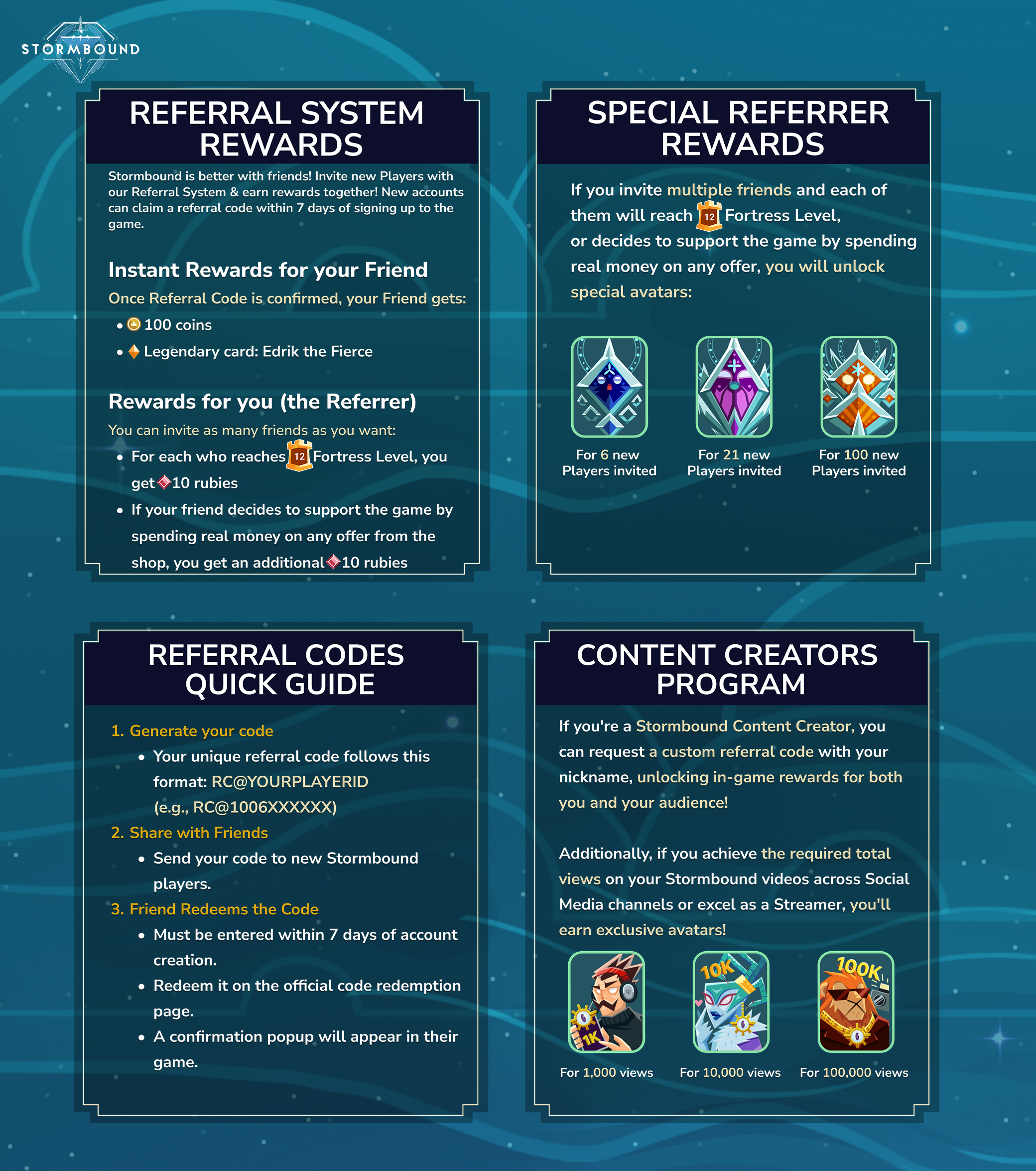 - Content Creator Program – If you're a content creator, you can promote Stormbound using a special referral code linked to your nickname. This helps grow the community while offering exclusive perks for you and your audience.