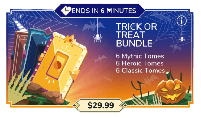 The Trick or Treat big bundle of sweets will also be available between October 4th and October 10th. It will yield 6 Mythic Tomes, 6 Heroic Tomes, and 6 Classic Tomes for $29.99.
